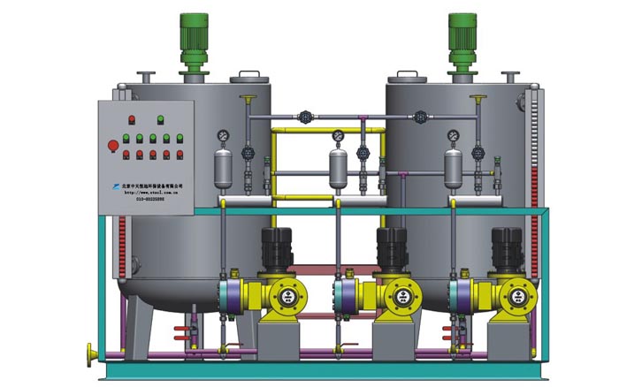 加藥裝置主要由溶液箱、計量泵、安全閥、液位計、針型閥、球閥、攪拌器、Y型過濾器、底盤等部件組成。投用時將固體磷酸鹽加入溶液箱內,然后按比例注入除鹽水或凝結水開動攪拌器攪拌幫助溶解,成品磷酸鹽溶液由計量泵注入鍋爐汽包內。加藥的運行工況均根據爐水的硬度來確定加藥方式。操作方式分為手動控別方式,也可依據上位系統輸出的控制信號,進行自動控制,實現自動加藥。
