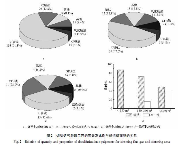 燒結(jié)機(jī)面積大于等于360m2時(shí),共投運(yùn)脫硫裝置46套。由圖2c可見:脫硫工藝應(yīng)用5套以上的有石灰石-石膏法、CFB法、氨法和SDA法,占比依次為32.6%、23.9%、15.2%和13.0%;石灰石-石膏法和氨法等濕法的占比為48%,CFB法和SDA法等半干法的占比為37%。活性炭法脫硫工藝的應(yīng)用有2套。