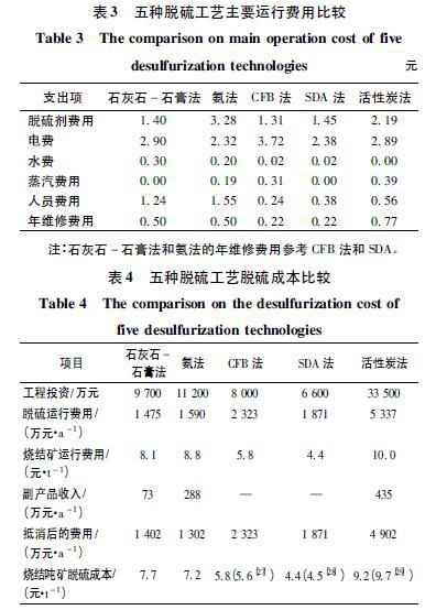 活性炭法的運(yùn)行費(fèi)用比較高,為10.0元/t燒結(jié)礦;其次依次是氨法、石灰石-石膏法、CFB法和SDA法,分別為8.8,8.1,5.8,4.4元/t燒結(jié)礦。