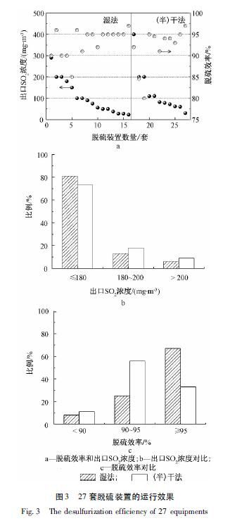 圖3b對(duì)比了濕法和(半)干法出口SO2濃度:出口SO2濃度≤180mg/m3時(shí),濕法和(半)干法脫硫套數(shù)占比分別為81%和73%;出口180mg/m3200mg/m3時(shí),濕法和(半)干法脫硫套數(shù)占比分別為6%和9%。圖3c對(duì)比了濕法和(半)干法的脫硫效率:脫硫效率<90%時(shí),濕法和(半)干法脫硫套數(shù)占比分別為6%和18%;90%≤脫硫效率<95%時(shí),濕法和(半)干法脫硫套數(shù)占比分別為31%和55%;脫硫效率≥95%時(shí),濕法和(半)干法脫硫套數(shù)占比分別為63%和27%。